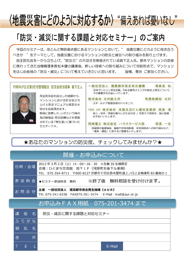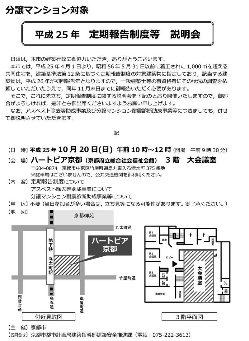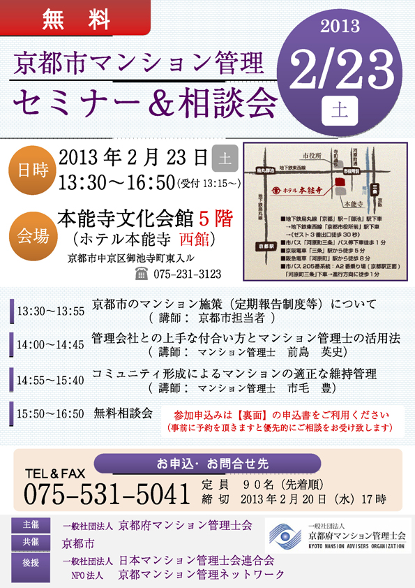- 一般社団法人 京都府マンション管理士会主催で(京都市と共催)、平成26年2月22日(土)に「京都市マンション管理セミナー」を開催します。