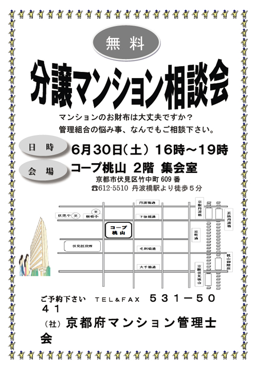 - 7月6日、京都府マンション管理士会所属の管理士による無料相談会が実施されます。当事務所も相談員として参加します。お気軽にお越しください。